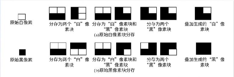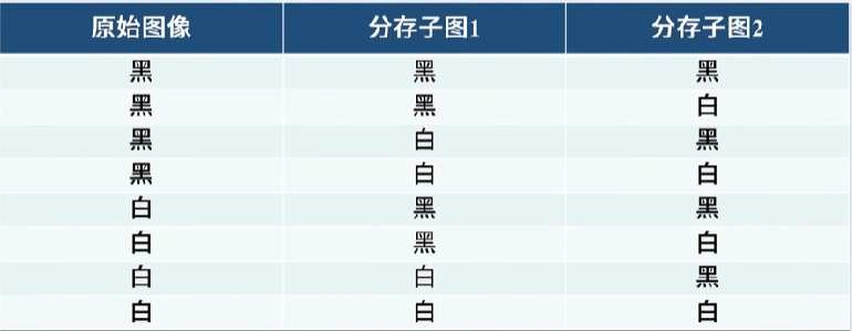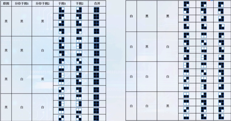- 依靠人眼解密的秘密共享方法:将一个秘密图像加密成n张分享图像,分别由n个人保管,解密时只需k’(k’≥k)个人将各自的分享图像叠加,秘密图像就会呈现,而少于k个人无法获得秘密图像的任何一点信息。